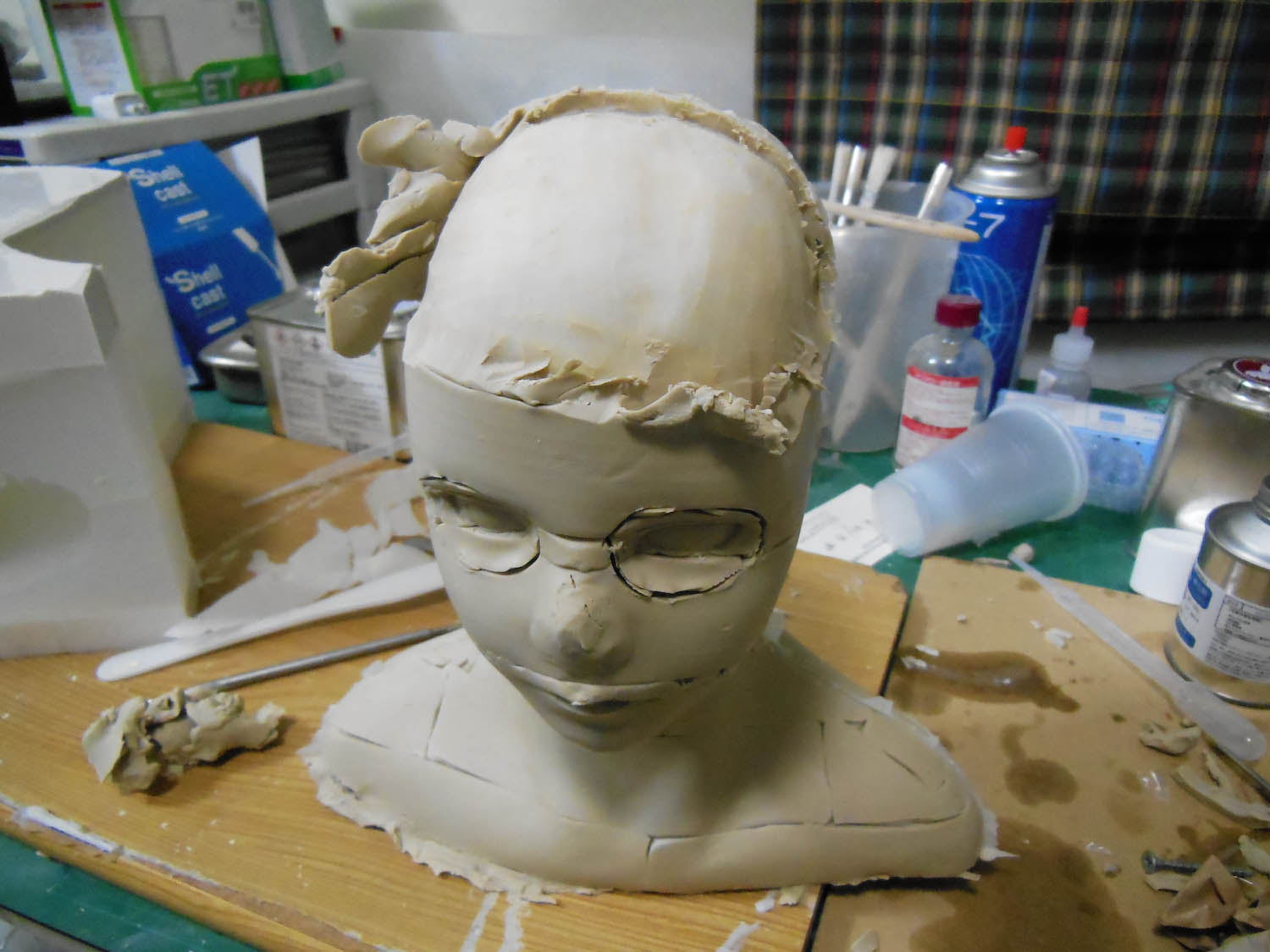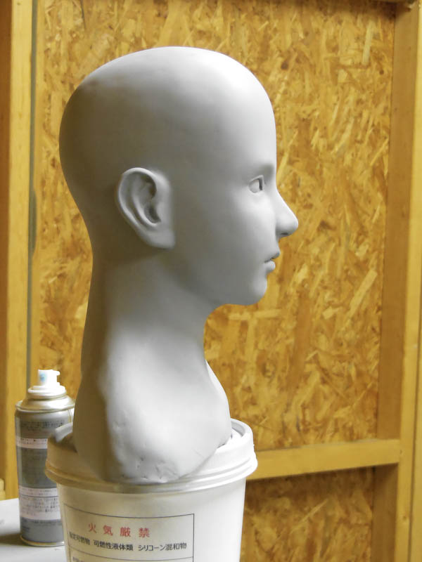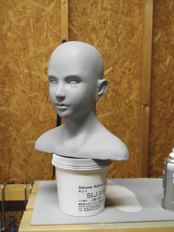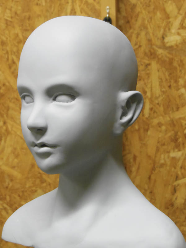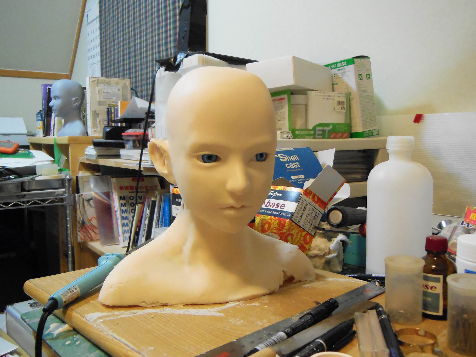 ムリに型から抜いたために首を複雑骨折したヘッド原型。 あんまり可哀想なので修復しました。 修復ついでに首を3mm延長。 耳は後付けにしようと思っていたのですが、接合跡が目立ちそうなので 耳付きで型を取ることに。 Gel-10にシリコンは使えないことが判明したので考えなくては… 左側こんな感じ 右側こんな感じ 試しに有り物のウィッグを付けてみた、スケバン!?