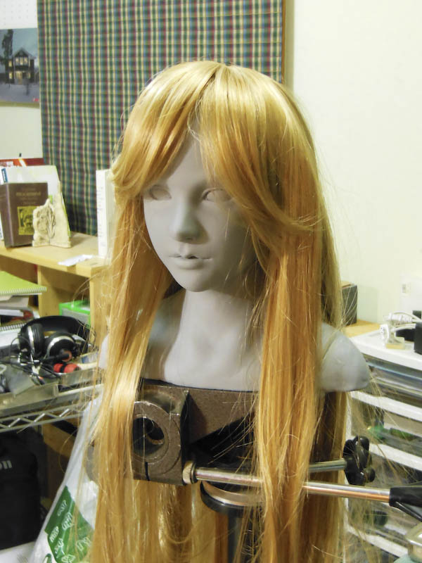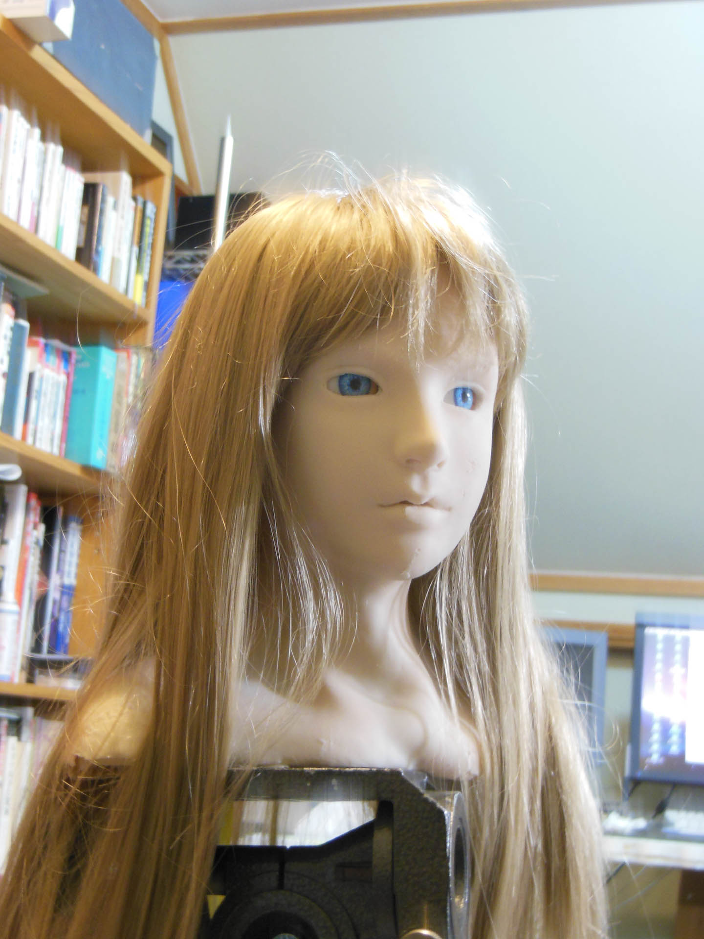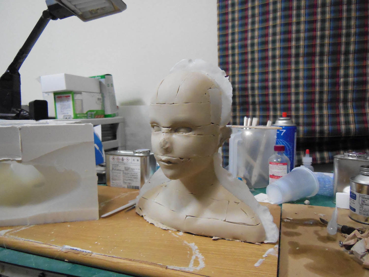 ムリに型から抜いたために首を複雑骨折したヘッド原型。 あんまり可哀想なので修復しました。 修復ついでに首を3mm延長。 耳は後付けにしようと思っていたのですが、接合跡が目立ちそうなので 耳付きで型を取ることに。 Gel-10にシリコンは使えないことが判明したので考えなくては… 左側こんな感じ 右側こんな感じ 試しに有り物のウィッグを付けてみた、スケバン!?