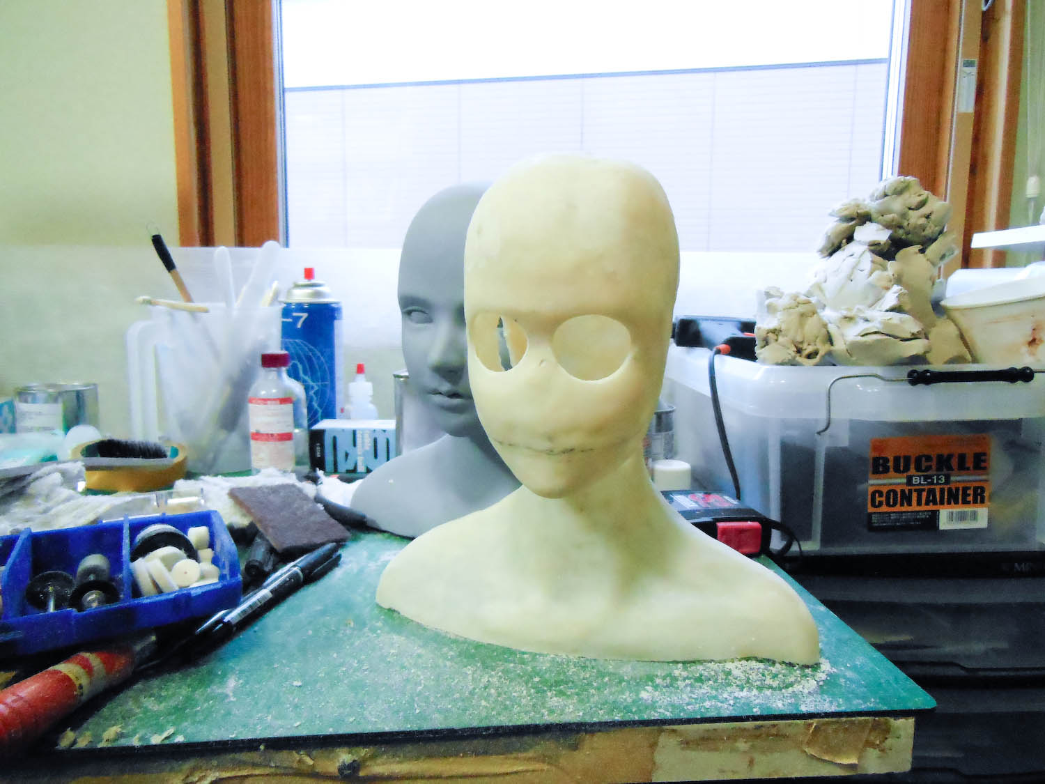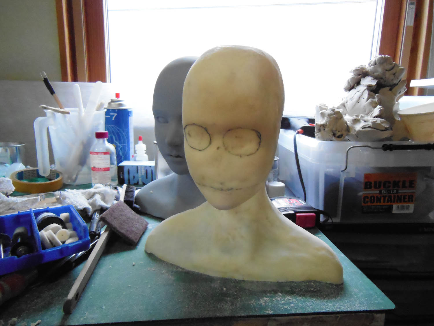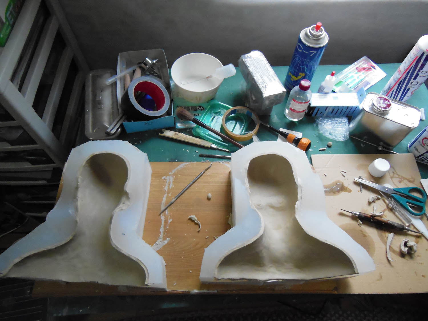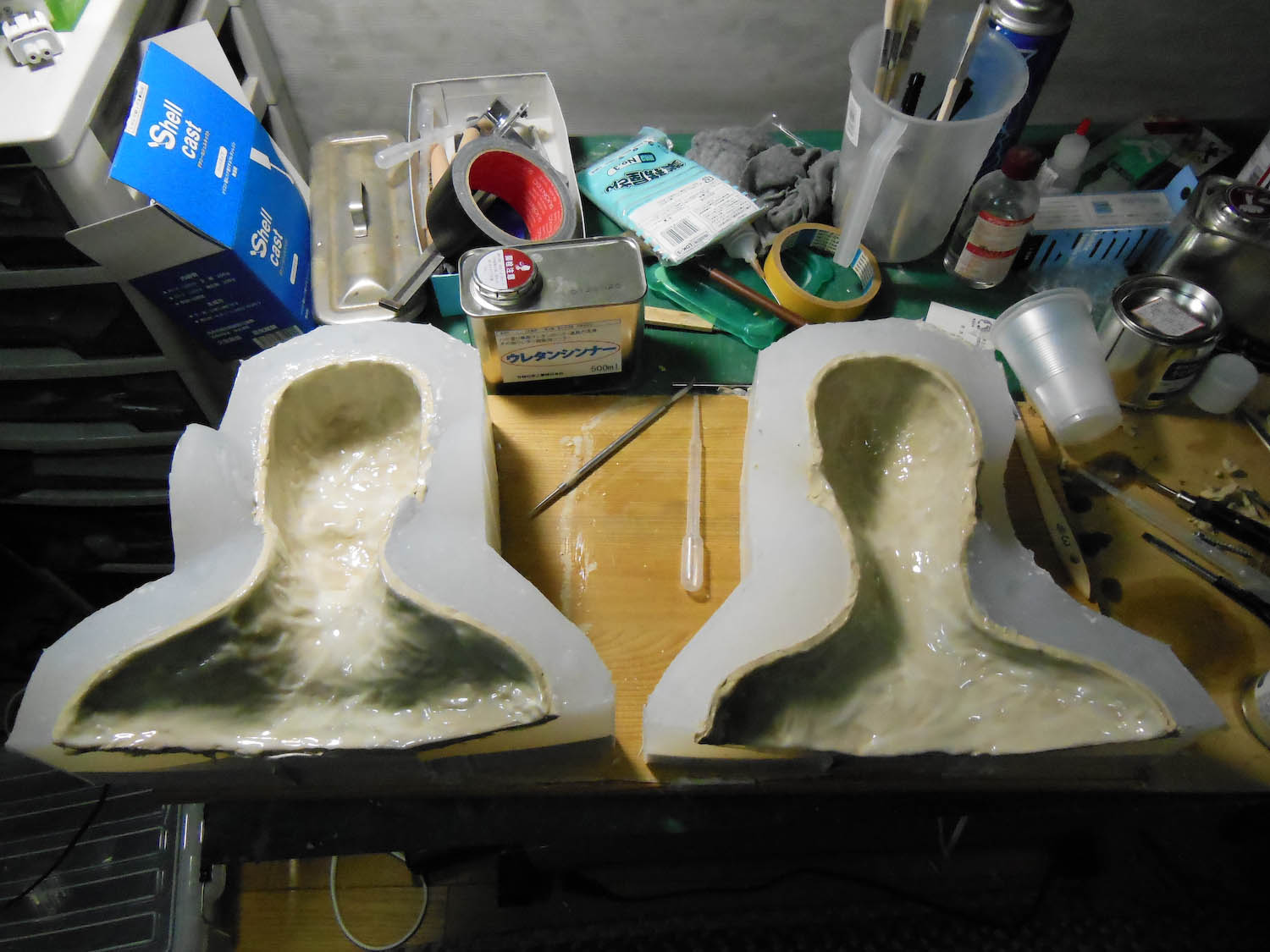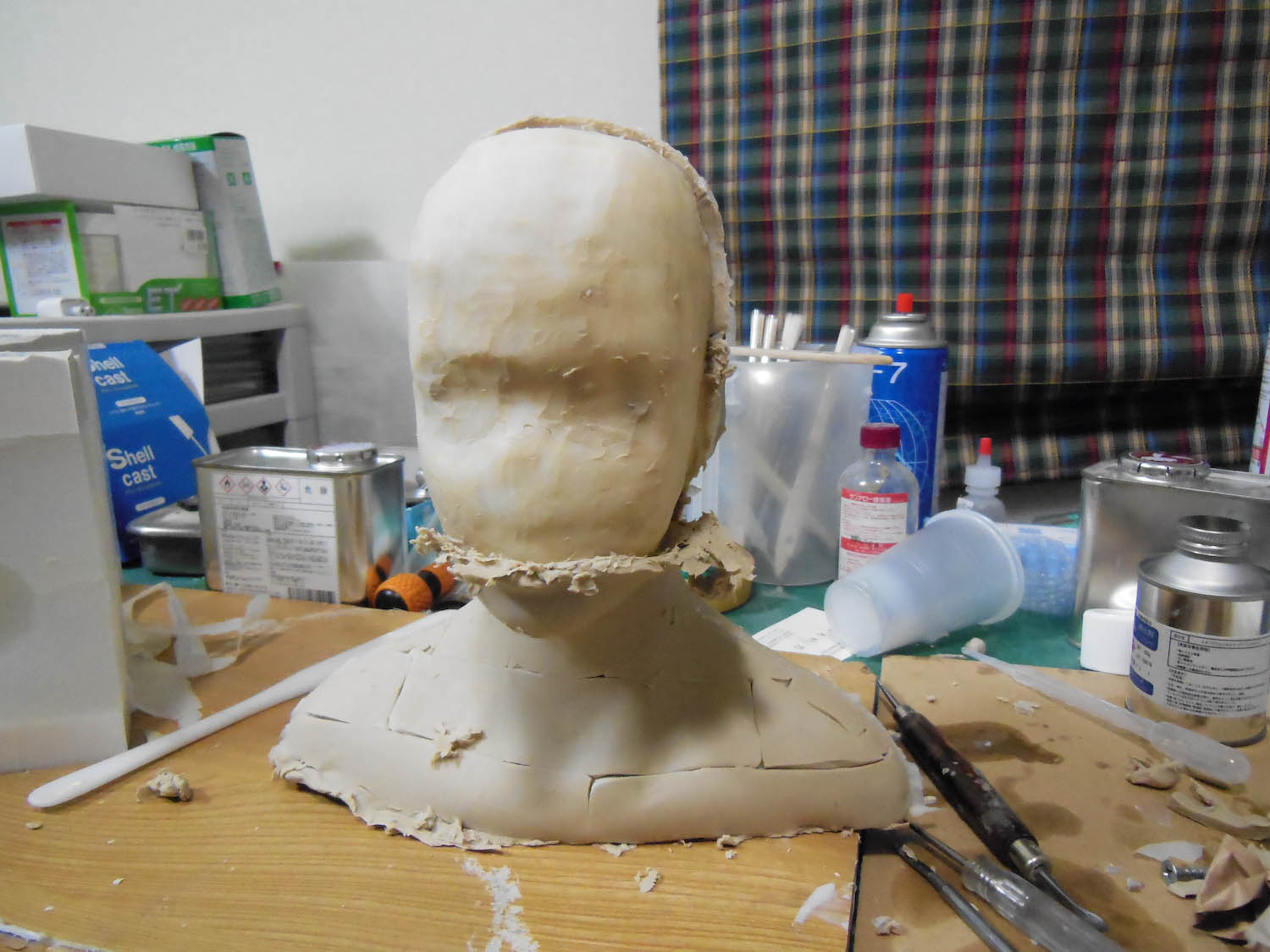 シリコン型からでる物質によりGel-10の硬化阻害が起こるのは シリコンが縮合型の時みたいなので、付加型シリコンで型を取ってみた。 そのモールドからインナーシェル(骨格みたいなの)をとるため 5mm厚にカットした粘土板を貼り詰め、 シェルキャストを積層していく 硬化したらシリコン型(左に見えます)から取り出し 粘土を剥いで行きます。(グロ注意かも) 後ろから… 前から… ドレメルでバリを取ってベビーオイルで残った粘土を除去。 マジックでアタリを取って 眼窩(がんか)を開けます! このあと、下あごと首を分割してメカを仕込みます。 先は長いな〜