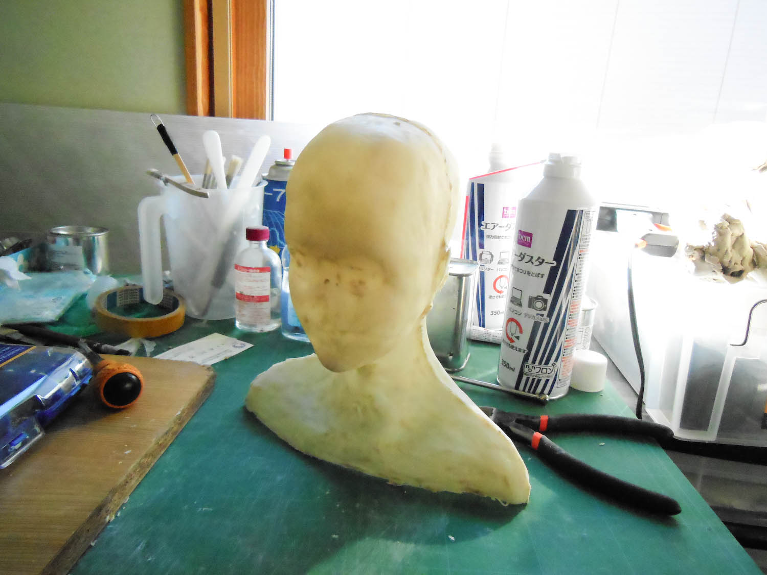 目と口のアタリを取るためと、肌の色テストのため 試しにシリコン(Gel-10)で抜いてみた。 離型剤の薄かった所があって型にもってかれた部分もあるが 感じは掴めてきた。 スケキヨ?