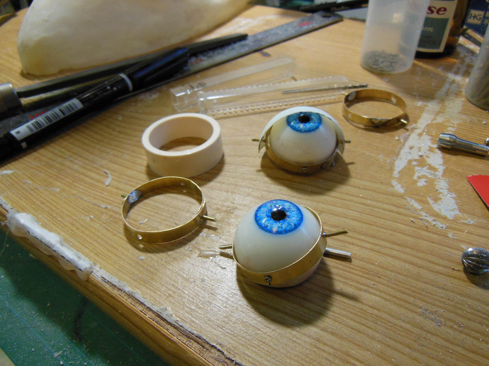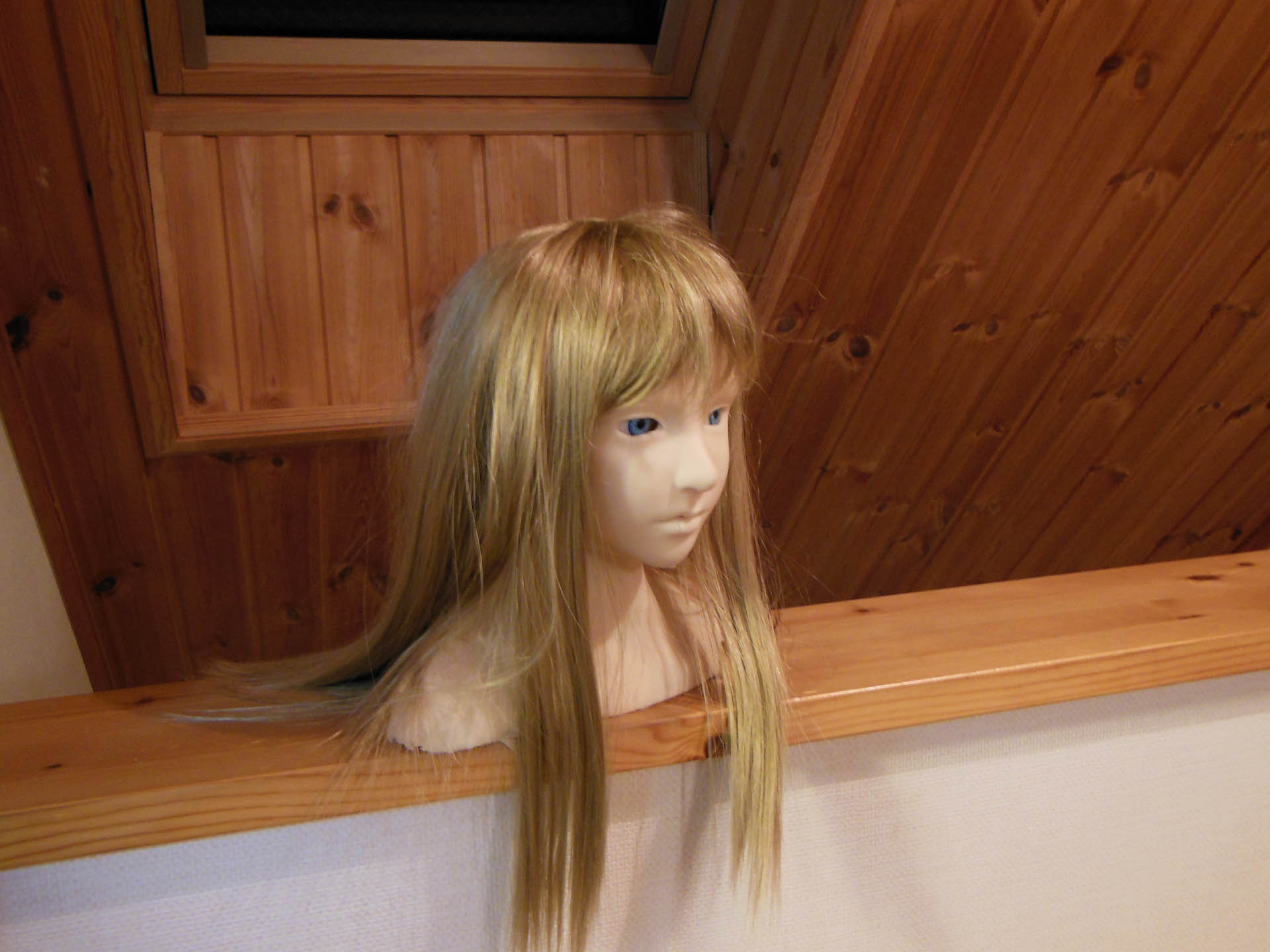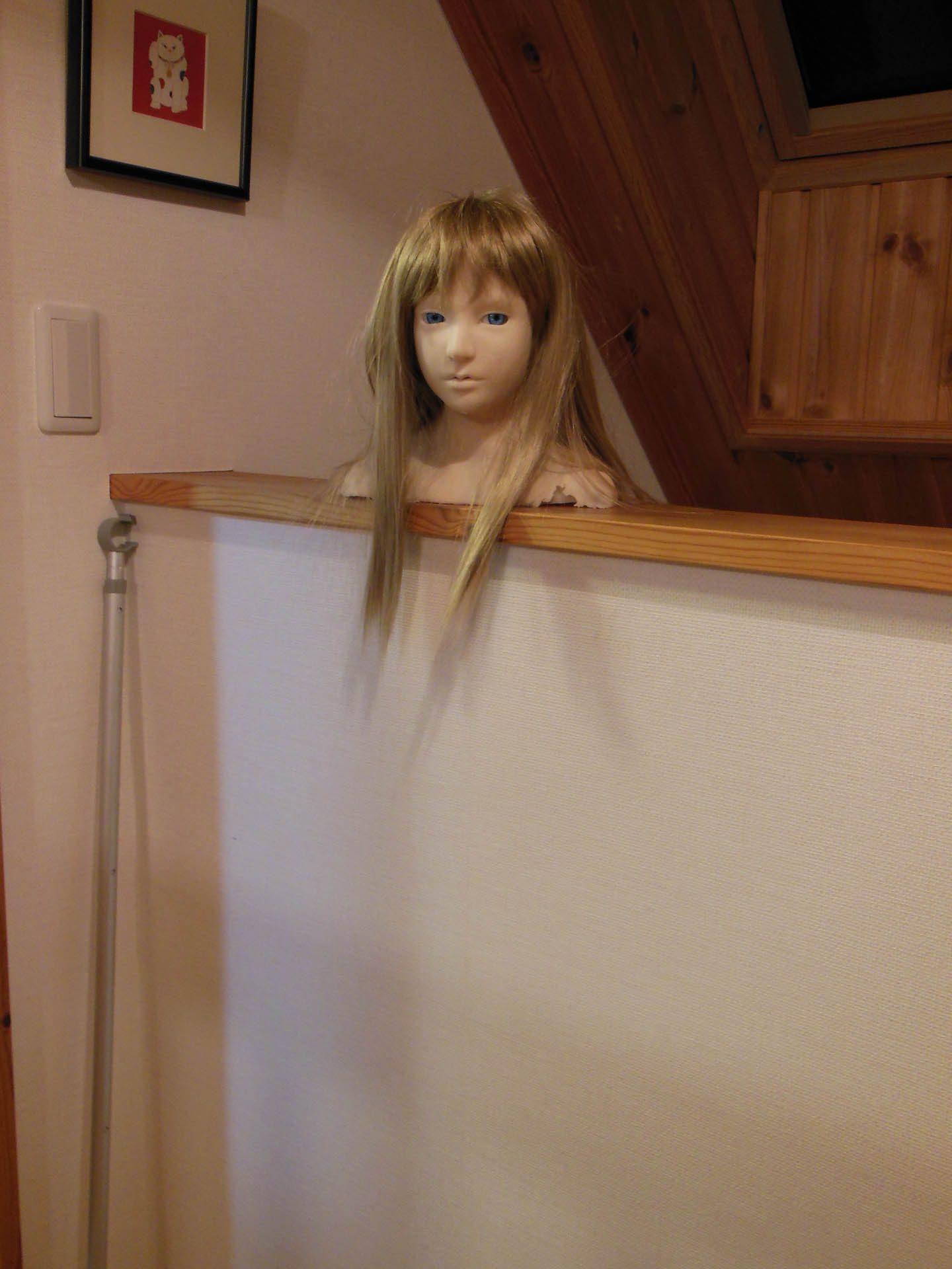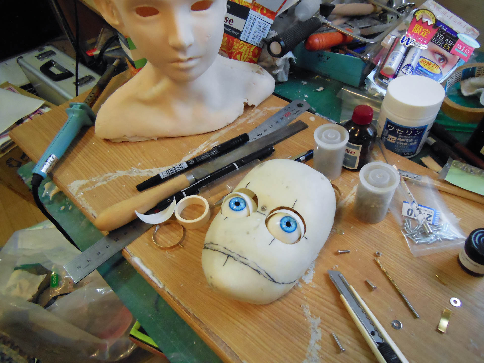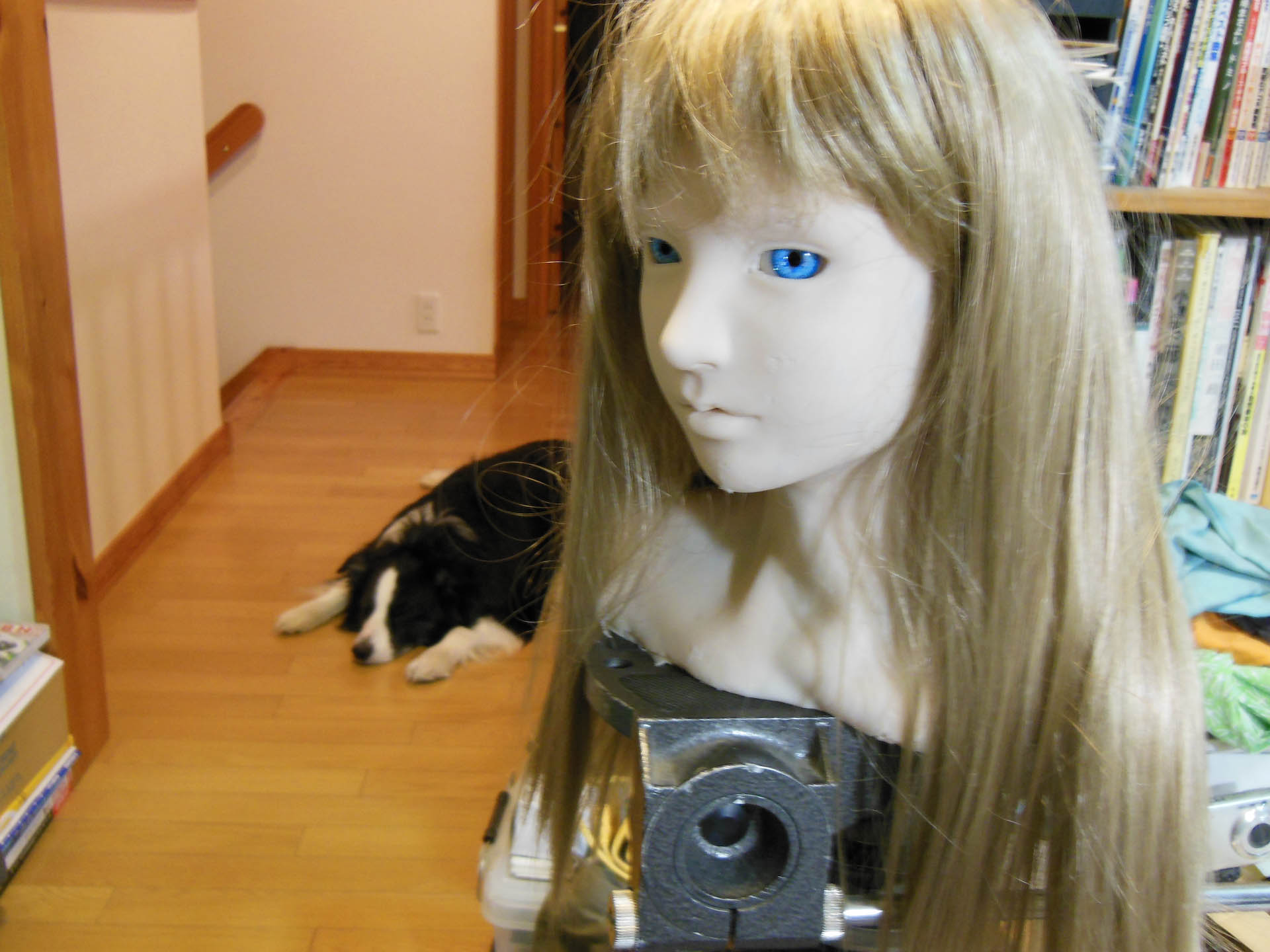 背後で謎の生き物が寝てるが気にしないで… インナーシェルに眼窩を開けたのでテストで組んでみたよ。 眼球の取り付けは、 5mm巾の真鍮板をハンダ付け、眼球の枠を作り 眼球をセット。 ピンポン玉で“まぶた”を作って、 エヴァ素体、インナーシェルに取付け。 眼球は上下左右に動き、まぶたの開閉も可能。 コントロールをサーボにするかワイヤーで動かすか、は未だ考え中。 あごももちろん開閉の予定。 皮をかぶせるとこんな感じ。 ドール用ウィッグをつけてみた。 階段の手すりに置いてみた。 ロングだとこんな感じ。 眉も睫毛もないしスッピン(?)なのでちょっとコワい子!