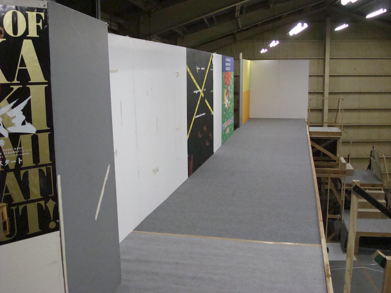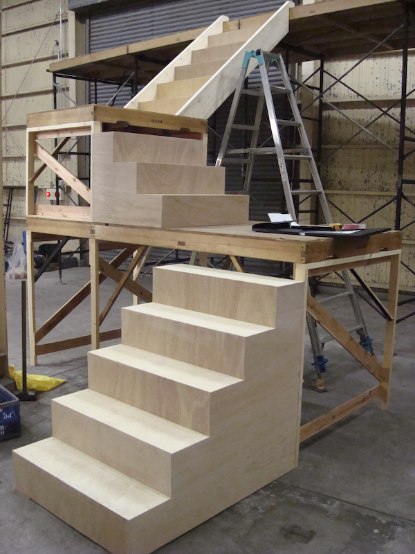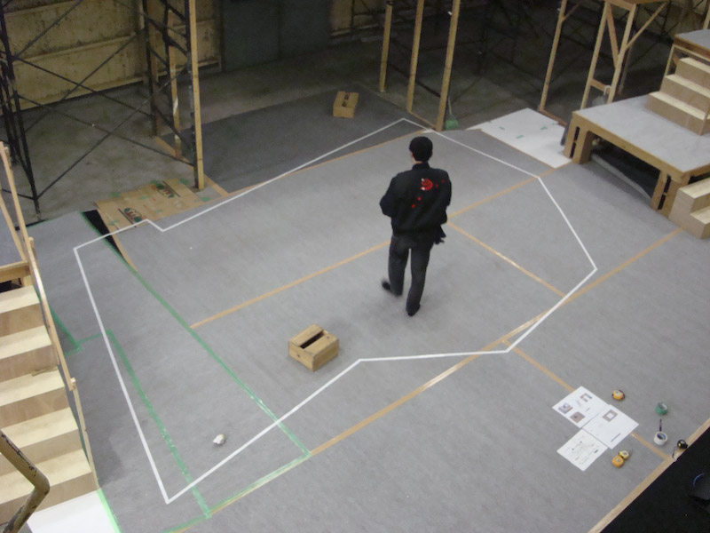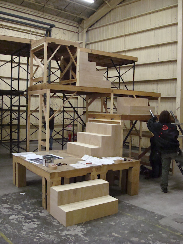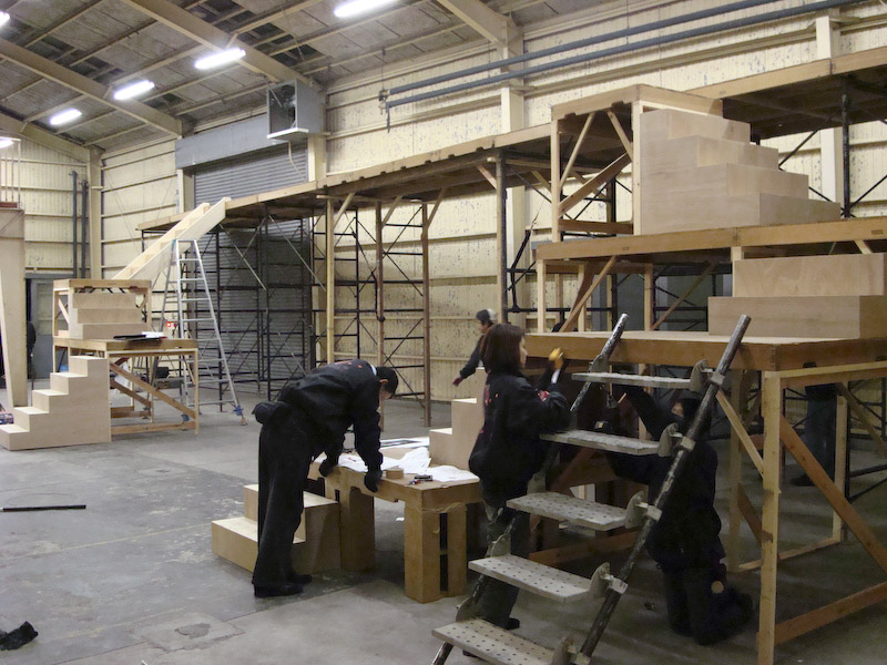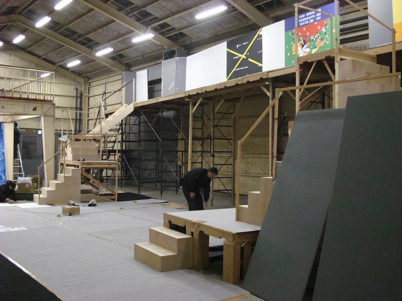 卸町倉庫の建て込み状況です。 寒い中みんながんばっております。 それにしてもデカッ! 上手側から撮影 上手階段状況です。 七ヶ浜バージョンのため2尺台が小さいです。 こちらは下手の階段、スナック「シェルブール」の裏手です。 プラットホーム上から。高っ!